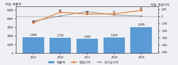 최근 실적을 살펴보면 2019년 매출액이 최근 5년 중 가장 높은 실적을 기록했음을 알 수 있다. 이전 최고 실적이었던 2015년 보다도 60.9%(1137억 8천만원) 늘어난 것으로 나타났다.