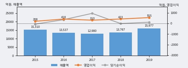 최근 실적을 살펴보면 2019년 매출액이 최근 5년 중 가장 높은 실적을 기록했음을 알 수 있다. 이전 최고 실적이었던 2015년 보다도 4.4%(667억 4천만원) 늘어난 것으로 나타났다.