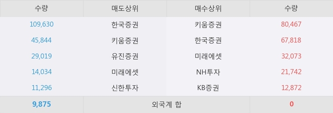 이 시각 주요 거래원은 미래에셋, 한국증권, 키움증권 등이 매도 상위 창구에 자리하고 있다.