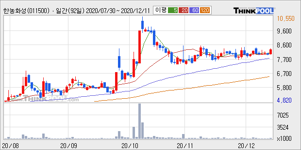 한농화성은 2019년 매출액 2047억원과 영업이익 120억원을 기록했다. 전년대비 매출은 -8.3% 하락했고, 영업이익은 110.8% 상승했다. 이 회사의 매출액 증감률과 영업이익 증감률은 각각 코스피 하위 18%, 상위 14%에 해당된다.