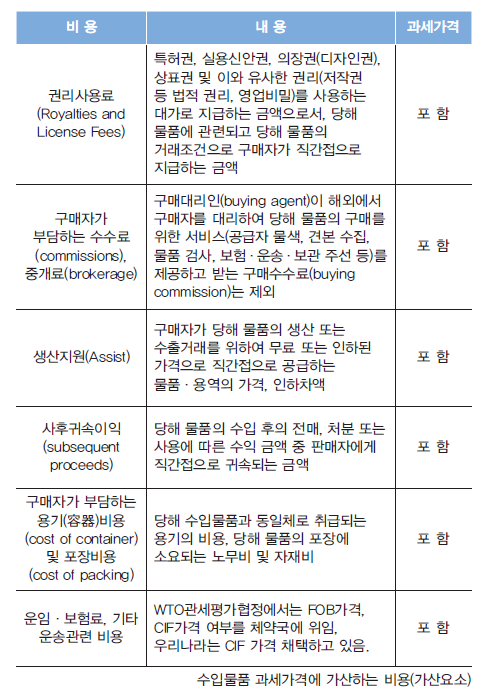 보통 수출자가 판매하는 물품의 가격은 송품장(상업송장, Commercial Invoice)에 기재되고, 수입기업은 송품장을 외국환은행에 제시하여 수입대금(물품대금)을 송금하기 때문에 수입물품 가격만을 관세의 과세가격으로 생각하는 경우가 대부분이다. 그러나 국내 수입기업이 아래 비용을 지급하는 경우에는 물품대금이 아니더라도 과세요건을 갖춘 경우에는 가산하는 비용으로 수입물품 과세가격에 포함하여야 하므로 주의하여야 한다.