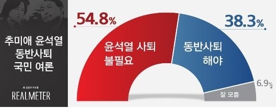 리얼미터가 YTN 의뢰로 지난 18일 전국 18세 이상 남녀 500명을 조사한 결과, 응답자의 54.8%는 "윤 총장의 사퇴는 불필요하다"고 답변했다.