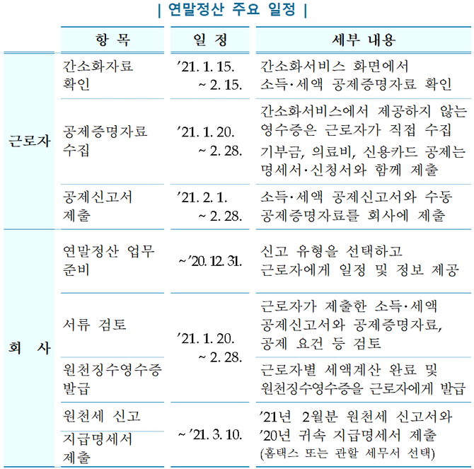 사업자는 올해 연말까지 신고유형을 선택해 근로자에게 일정 및 관련 정보를 제공하고, 1월 20일부터 2월 28일까지 근로자가 제출한 소득・세액 공제신고서와 공제증명자료, 공제 요건 등을 검토해 근로자별 세액계산을 마치고 원천징수영수증을 근로자에게 발급해야 한다.