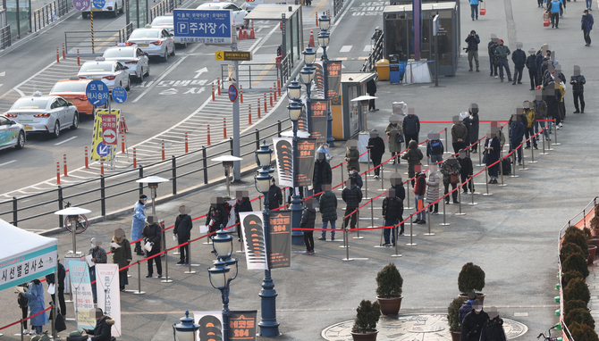 26일 오전 서울역 광장에 설치된 중구 임시 선별검사소에서 시민들이 신종 코로나바이러스 감염증 검사를 받기 위해 차례를 기다리고 있다. 중앙방역대책본부는 이날 0시 기준으로 코로나19 신규 확진자가 1천132명 늘어 누적 5만5천902명이라고 밝혔다.