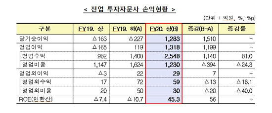 28일 금융감독원에 따르면 2020 사업연도 상반기(4∼9월) 전업 투자자문사 215곳의 순이익은 총 1천283억이었다.