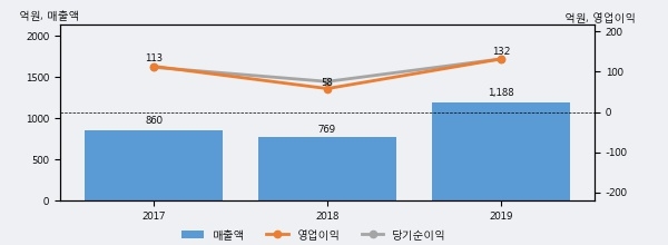 최근 실적을 살펴보면 2019년 매출액이 최근 3년 중 가장 높은 실적을 기록했음을 알 수 있다. 이전 최고 실적이었던 2017년 보다도 38.1%(327억 7천만원) 늘어난 것으로 나타났다.
