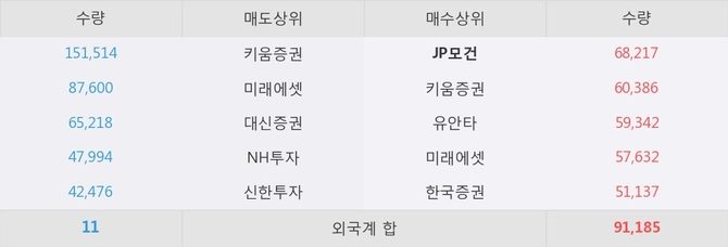 거래원 동향은 JP모건, 미래에셋이 매수 상위 목록에 나타나고 있다.