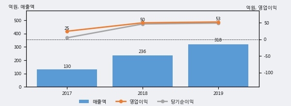 최근 실적을 살펴보면 2019년 매출액이 최근 3년 중 가장 높은 실적을 기록했음을 알 수 있다. 이전 최고 실적이었던 2018년 보다도 34.6%(81억 8천만원) 늘어난 것으로 나타났다.