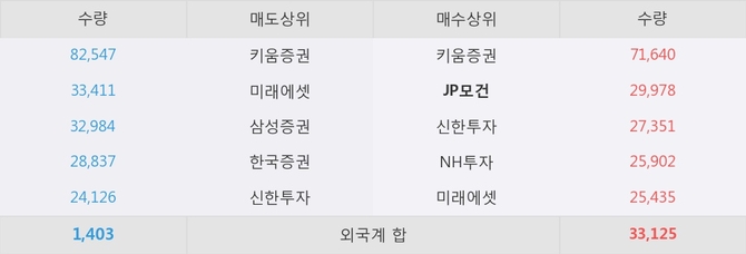 거래원 동향은 JP모건, NH투자, 미래에셋 등이 매수 상위 목록에 나타나고 있다.