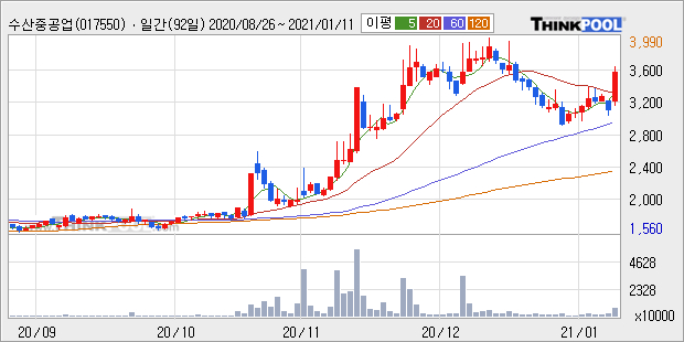 수산중공업은 2019년 매출액 1578억원과 영업이익 72억원을 기록했다. 전년대비 매출은 86.5%, 영업이익은 1,623.8% 각각 상승했다. 이 회사의 매출액 증감률과 영업이익 증감률은 각각 코스피 상위 2%, 상위 1%에 해당된다.