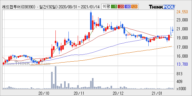 레드캡투어는 2019년 매출액 2588억원과 영업이익 350억원을 기록했다. 전년대비 매출은 1.5%, 영업이익은 37.3% 각각 상승했다. 이 회사의 매출액 증감률과 영업이익 증감률은 각각 코스닥 하위 43%, 상위 32%에 해당된다.