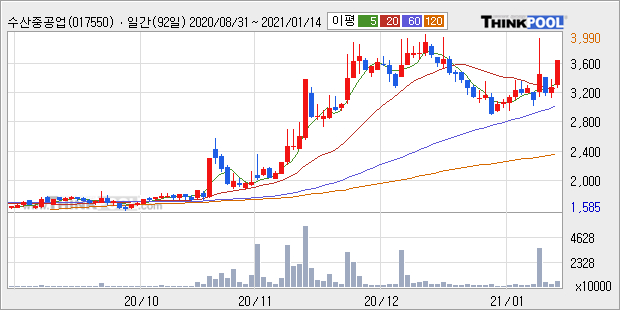 수산중공업은 2019년 매출액 1578억원과 영업이익 72억원을 기록했다. 전년대비 매출은 86.5%, 영업이익은 1,623.8% 각각 상승했다. 이 회사의 매출액 증감률과 영업이익 증감률은 각각 코스피 상위 2%, 상위 1%에 해당된다.