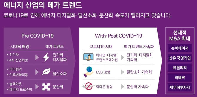보고서는 코로나19로 기존 에너지 산업의 메가 트랜드가 가속화되면서 미래의 에너지 시장 선점을 위한 글로벌 플레이어들의 발 빠른 움직임이 이어졌다고 해석했다.