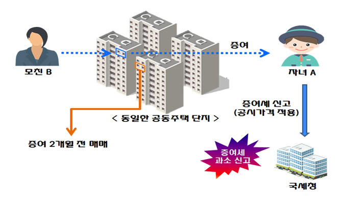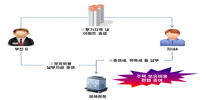 그러나 국세청 검증결과 자녀 A는 고액의 증여세, 취득세 등 주택 보유비용을 납부할 만한 재산이 없었다. 국세청은 자녀 A가 부친 B로부터 관련 자금을 편법 증여받은 혐의에 대해 조사에 나섰다.
