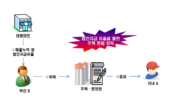 그러나 국세청이 해당 주택과 분양권을 사들인 과정을 살펴보는 과정에서 부친 B가 운영하는 대형마트의 매출을 누락하고 가공경비 계상 등 부당한 방법으로 유출한 돈이 흘러 들어갔을 가능성이 크게 제시됐다.