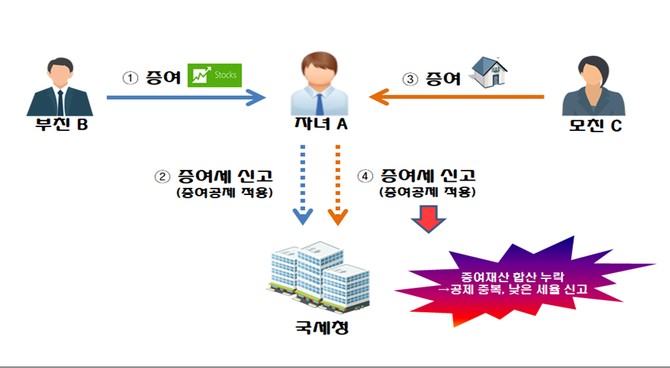 이후 모친 C로부터 고가 아파트를 증여받고 증여세 신고를 하면서 부친 B로부터 받은 재산가액을 더하지 않고, 증여재산공제를 중복 적용받았다.