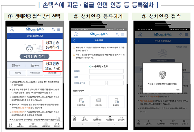 지문인증으로 전자·세금계산서를 발급하려면 모바일 손택스 앱에서 ‘지문 또는 생체인증 등록하기’를 선택한 후 아이디와 주민등록번호를 입력한 후 공동인증서 등을 통해 본인 인증 후 지문을 등록해야 한다.