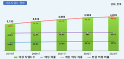 (조세금융신문=고승주 기자) 지난해 여성사업자 수가 첫 400만명을 돌파했다. 국세청이 12일 공개한 부가가치세 신고 현황 자료에 따르면, 지난해 말 기준 여성 가동사업자 수는 401.8만개로 전체 사업자 가운데 40.4%를 차지했다. 업태별로는 부동산임대업(116.4만개, 29.0%), 서비스업(83.8만개, 20.9%), 소매업(77.6만개, 19.3%) 순이었다. 음식업은 11.9%(47.7만개) 수준이었으며, 도매업은 4.9%(19.6만개)였다. 여성 가동사업자 수는 계속 증가추세로 2019년 315.3만개에서 2020년 343.5만개, 2021년 369.3만개, 2022년 390.3만개, 2023년 401.8만개였다. [조세금융신문(tfmedia.co.kr), 무단전재 및 재배포 금지]