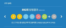 (조세금융신문=고은선 기자) 로또 892회 당첨번호와 당첨 지역이 공개됐다. 4일 동행복권은 로또 제892회 1등 당첨번호는 '4, 9, 17, 18, 26, 42'다. 2등 보너스 번호는 '36'이다. 당첨번호 6개의 숫자를 모두 맞힌 1등 당첨자는 전국 17명으로 각각 1,282,017,464원씩 받는다. 5개의 숫자와 보너스 번호가 일치한 2등은 78명으로 각각 46,569,011원씩 받게 된다. 로또 892회 1등이 배출점은 서울 노원 'X복권방', 서울 양천 'X사랑', 서울 중구 '가로판매대제 XX호', 대전 중구 'GS25', 경기 고양 'XX행복복권', 경기 안양 '가두판매점', 안양 'XX복권방', 용인 'XX휴계실', 의정부 'XX슈퍼', 강원 원주 'XX로또명당', 춘천 'XX로또', 충북 청주 'X마트', 전북 정읍 'XXX올수성점', 경북 김천 'XX복권', 제주 '로또명당XX' 등 총 17곳이다. 제 262회차 부터 현재까지의 1등 당첨판매점은 서울 노구에 위치한 '스X'로 총 35번의 1등이 배출됐다. 이어 부산 'XX카서비스' 34번, 대구 달서구 'XX복권편의점' 24번, 대구 서구 'XX전자통신' 16번, 경기 용인 'XX휴