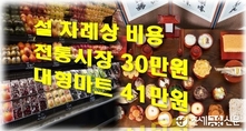 (조세금융신문=구재회 기자) 정부가 역대 최대 규모의 '설 명절 대책'을 내놓은 가운데 올해 4인 기준 설 차례상 비용이 전통시장 30만원, 대형마트 41만원으로 역대 가장 비싼 수준이라는 조사가 나왔다. 다만 대형마트의 경우, 정부할인과 유통업체 자체 할인을 적용하면 28만원으로 많이 줄고, 전통시장도 온누리상품권 환급행사 등으로 비용 부담이 줄어들 전망이다. 12일 한국물가정보는 지난 10일 기준 설 차례상 비용(4인 기준)이 전통시장 30만 2500원, 대형마트 40만 9510원으로 집계, 지난해 설보다 각각 6.7%, 7.2% 상승했다고 밝혔다. 전통시장에서 장을 볼 경우 지난해 설보다 과일류는 57.9%, 채소류는 32.0% 각각 올랐다. 반면 나물류와 수산물, 약과·유과 등 과자류 가격은 차이가 없었다. 과일의 경우 부사 사과(3개)값은 지난해 1만 5천원에서 올해 1만 8천원으로 20.0% 올랐고, 배(3개) 가격은 1만3천500원에서 2만7천원으로 두배가 됐다. 물가정보는 “과일류는 작년에 이어 올해도 날씨 영향으로 가격이 올랐다”며 “배는 여름 폭염과 집중호우로 생산량이 줄고 상품성 저하로 저장량이 줄어든 것이 원인”이라고 설명했다. 전통시장