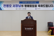 (조세금융신문=김영기 기자) 전병오 제50대 강서세무서장이 지난 30일 강서세무서 강당에서 명예퇴임식을 갖고 약 38년간 이어온 공직생활을 마무리했다. 현장에는 국세청 및 세정기관 관계자와 지역 경제계 인사, 세무·회계 전문가, 그리고 가족 등 다수가 참석했다. 퇴임식은 내빈 소개, 공직 연혁 영상 상영, 송사, 퇴임사 순으로 진행됐다. 행사 초반 사회자는 “서장님이 오늘 이 자리에 있기까지 헌신해주신 분”이라며 배우자 조미숙 여사를 가장 먼저 소개했고, 자녀 전지수 씨와 전진영 씨도 조용히 자리를 함께했다. 국세청 측에서는 반재훈 서울지방국세청 징세관이 서울국세청장을 대신해 참석했으며, 박재성 영등포세무서장, 김수섭 양천세무서장, 김승현 동작세무서장 등이 나란히 자리했다. 명예서장단에서는 송진수 회장이 참석했다. 이날 행사에는 황인환 코위버㈜ 회장, 김병희 오신산업㈜ 회장, 조좌진 ㈜디와이피앤에프 회장, 김명회 ㈜대명이십일 회장, 공경식 ㈜Y&K투게더 대표이사가 참석했다. 이정희 강서지역세무사회 회장, 김수홍 간사, 최광원 김앤장 회계사도 자리를 함께했다. 전 서장은 1967년 전북 고창 출생으로 1988년 남원세무서를 초임으로 국세청에 입직했다.