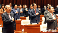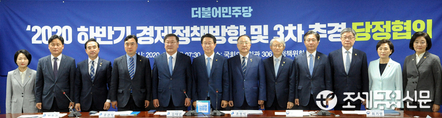 (조세금융신문=김용진 기자) 김태년 더불어민주당 원내대표와 홍남기 겸제 부총리 겸 기획재정부 장관이 1일 오전 국회 의원회관에서 열린 하반기 경제정책 방향 및 3차 추경 당정협의회에 앞서 참석자들과 기념 촬영을 하고 있다. [조세금융신문(tfmedia.co.kr), 무단전재 및 재배포 금지]