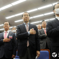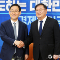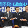 (조세금융신문=김용진 기자) 이해찬(중앙) 더불어민주당 대표가 13일 오후 국회 본청에서 열린 더불어민주당-더불어시민당 합당수임기관 합동회의에 앞서 김태년(왼쪽에서 6번째) 더불어민주당 원내대표, 우희종(왼쪽에서 4번째) 더불어시민당 대표와 손을 맞 잡고 기념 촬영을 하고 있다 [조세금융신문(tfmedia.co.kr), 무단전재 및 재배포 금지]