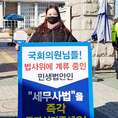 (조세금융신문=김용진 기자) 박유리 한국세무사고시회 총무이사가 31일 오전 국회 정문 앞에서 세무사법 개정안을 즉각 의결하라는 1인 시위를 하고있다. [조세금융신문(tfmedia.co.kr), 무단전재 및 재배포 금지]