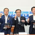 (조세금융신문=김용진 기자)이해찬 더불어민주당 대표와 이인영 원내대표, 최고위원들이 23일 오전 국회에서 열린 당 대표-최고위원 취임 1주년 공동 기자회견에서 열심히 뛰자는 취지로 운동화를 들고 파이팅을 외치고 있다.