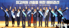 (조세금융신문=김용진 기자) 24일 오후 국회의원회관에서 열린 더불어민주당 최고위원 예비 경선 선출대회에서 후보자들이 함께 손을 들어 보이고 있다. 민주당은 이날 예비경선대회에서 차기 지도부 선출을 위한 8.29 전당대회 최고위원 후보 등록자 10명 중 2명을 컷오프 한다. 최종 5명을 뽑는 선출직 최고위원 경선에는 노웅래(4선), 이원욱(3선), 김종민(재선), 소병훈(재선), 신동근(재선), 이재정(재선), 한병도(재선), 양향자(초선) 의원, 염태영 수원시장, 정광일 안중근평화재단청년아카데미 대표 등이 출마했다. [조세금융신문(tfmedia.co.kr), 무단전재 및 재배포 금지]