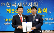 (조세금융신문=김용진 기자) 이창식 한국세무사고시회 총무 부회장이 30일 오후 한국세무사회 회관에서 열린 제58회 한국세무사회 정기총회에서 원경희 한국세무사회 회장으로부터 고용노동부 장관상 수상을 하고 있다. [조세금융신문(tfmedia.co.kr), 무단전재 및 재배포 금지]
