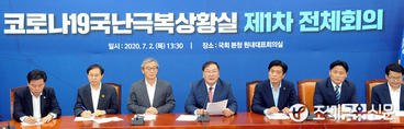 (조세금융신문=김용진 기자) 김태년 더불어민주당 원내대표(중앙)가 2일 오후 국회 본청에서 열린 코로나19 국난극복상황실 제1차 전체회의에서 발언을 하고 있다. [조세금융신문(tfmedia.co.kr), 무단전재 및 재배포 금지]