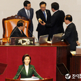 (조세금융신문=김용진 기자)나경원 자유한국당 원내대표가 12일 오전 국회 본회의장에서 교섭단체 대표연설을 하던 중 문 대통령이북한의 대변인이라는 발언을 하자 홍영표 더불어민주당 원내대표(뒷줄 가운데)가 국회의장석으로 나가 강하게 항의하고 있다