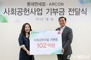 롯데면세점 이홍균 대표이사(오른쪽)가 3일 롯데면세점 본사에서 아르콘 허인정 이사장(왼쪽)에게 사회공헌사업 진행을 위한 기부금 102억을 전달했다. <사진제공=롯데면세점>(조세금융신문=김태효 기자)롯데면세점은3일서울시중구소공동본사대회의실에서비영리기관인문화예술사회공헌네트워크(아르콘)와사회공헌사업을위한102억원기부금전달식을진행했다고밝혔다.이날행사에는롯데면세점이홍균대표를비롯해아르콘허인정이사장등양사관계자들이참석해취약계층지원및지역사회발전을위한사회공헌활동추진방안을모색하는시간을가졌다.롯데면세점은올해초사회공헌활동을위한기금총1