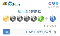 <로또655회당첨번호=나눔로또홈페이지>(조세금융신문=김태효 기자)20일추첨된로또복권655회1등당첨번호는7,37,38, 39, 40,44이다.2등보너스번호는18이다.로또당첨번호를모두맞춘1등당첨자는총9명이며,각16억6143만원의상금이지급된다.당첨번호5개와보너스번호'18'을맞힌2등은41명으로6078만원씩,당첨번호5개를맞힌3등은1610명으로154만원씩받는다.또한,4개를맞힌4등(고정당첨금5만원)은7만7437명,당첨번호3개가일치한5등(고정당첨금5천원)은128만1655명이다.한편,
