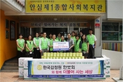 한국감정원 김한수 상임감사위원(첫줄 왼쪽 다섯번째), 류정복 한벗회 회장(첫줄 오른쪽 네번째)이 안심 제1종합사회복지관 김오기 관장(첫줄 오른쪽 세번째)에게 급식 후원용 물품을 전달하고 있다. <사진제공=한국감정원>(조세금융신문=김태효 기자)한국감정원(원장서종대)은16일대구동구소재지역무료급식시설에물품후원및봉사활동을실시했다고밝혔다.이날봉사활동에는김한수한국감정원상임감사위원을비롯해사내여성직원봉사활동모임인한벗회직원이참여했으며,대구동구소재안심제1종합사회복지관내무료급식소를방문해주방용기계,배달용보온도시락및식자재등을후원하고,도시락배달,배식봉사활동등을실시했다