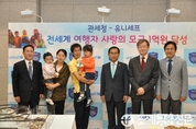 관세청이6일인천국제공항입국장에서'사랑의모금 전달행사'를진행한 가운데,김낙회 관세청장(오른쪽에서 세번째)과 박철구 인천공항세관장(왼쪽 첫번째), unicef한국위원회사무총장(오른쪽에서 두번째), 안성기 친선대사(오른쪽 첫번째), 여행자 가족(왼쪽에서 두번째)이기념촬영을 하고있다. <사진제공=관세청>(조세금융신문=김태효 기자)관세청은6일인천국제공항입국장에서해외여행자를대상으로'사랑의동전모으기'를진행해모금한5천만원을유니세프에전달했다.‘사랑의동전모으기운동’은관세청이유니세프와2003년부터12년간함께추진해온사업으로2005년,2006년,2009년,2012년네차례모금전달행사를통해5천만원을전달했으며,&