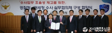 서울시 소재 경찰청에서 열린 수사 실무협의체 구성 협약식에서 관세청 노석환 조사감시국장과 경찰청 정용선 수사국장이 협의서에 서명한 후 기념촬영을 하고 있다. <사진제공=관세청>(조세금융신문=김태효 기자)관세청과경찰청은15일수사권한이다른데따른사각지대를없애고수사의효율성을높이기위해공조수사실무협의체를구성했다.관세청에 따르면, 이는국정과제의효율적수행등상호협력이긴밀한분야에대해공조수사가필요하다는양기관의공감대형성에따른것이다.실무협의체구성은노석환관세청조사감시국장과정용선경찰청수사국장이협의서에서명하는방식으로이뤄졌다.이날양기관은&n