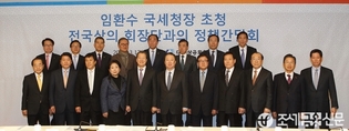 박용만 대한상공회의소 회장과 임환수 국세청장이 주요참석자들과 기념촬영을 하고 있다. (아랫줄 좌측부터 지창훈 대한항공 사장, 이인원 롯데그룹정책본부 부회장, 김동구 대구상의 회장, 홍재성 제이에스코퍼레이션 회장, 현정은 현대그룹 회장, 임환수 국세청장, 박용만 대한상의 회장, 박상진 삼성전자 사장, 신박제 NXP반도체 회장, 서민석 동일방직 회장, 이희평 충남북부상의 회장. 뒷줄 좌측부터 이동근 대한상의 상근부회장, 심경섭 한화그룹 사장, 김희용 동양물산기업 회장, 노영수 청주상의 회장, 이순형 세아제강 회장, 박희원 대전상의 회장, 이강신 인천상의 회장, 정몽윤 현대해상화재보험 회장)(조세금융신문=김태효 기자)국세청과대한상공회의소가경제활성화를위한상호협력을강화해나가기로했다.임환수국세청장과박용만대한상공회의소회장은17일남대문대한상의회관에서전국상의회장단20여명이참석한가운데정책간담회를갖고이같이밝혔다.&