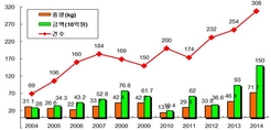 (조세금융신문)관세청은작년한해동안총308건,71.7kg,시가1500억원상당의마약류를적발했다고5일밝혔다.이는2013년과비교해건수21%,중량54%,금액62%각각증가한것이다.종류별로는메트암페타민(필로폰)이50.8kg(55건)으로가장많았고,합성대마등신종마약이17.3kg(167건),대마가2.7kg(66건)순으로나타났다.특히국내최대남용마약류인필로폰의경우,작년한해50.8kg(‘13년30.2kg)을적발했는데,이는지난2004년이후최대적발량으로