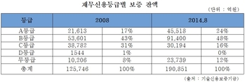 (조세금융신문) 기술신용보증기금이 재무신용 등급을 고려하여 중소기업을 지원한 것으로 밝혀졌다.새정치민주연합 김기식 의원이 국정감사를 앞두고 기술신용보증기금으부터 제출받은 자료에 따르면, 2014년 8월 기준 기보 보증 잔액 19조 851억 중 재무등급이 A와 B인 우량 기업이 차지하는 보증액이 13조 6918억 원으로 확인됐다. 이는 전체 보증의 72%에 달하는 금액이다.김 의원은 “기보는 2007년 2월 신용도 유의기업을 제외하고 재무심사 보증 제도를 폐지하고, 2011년 1월부터는 전부 기술평가로 전환했다”며 “그럼에도 불구하고 기보의 보증이 재무 등급이 우량인 기업에 쏠리고 있다는 것은 기보의 기술평가제도의 취지에 역행하는 것”이라고 지적했다.또한, “2014년 8월 보증잔액도 재무 등급이 좋은 A와 B등급 중심으로 지원되고, 2008년에 비해 담보여력이 없는 C이하, 무등급 기업의 비중이 12%나 감소했다”며 “이를 통해 기보의 보증심사에서 재무 건전성의 비중이 높아지고 있는 것을 알 수 있다”고 강조했다.김 의원은 “기보의 재무 중심의 보증 심사는 기업의 신용도를 심사하여 신용보증서를 제공함으로써 금융기관으로부터 대출을 받게 하는 신보와의 차별성이