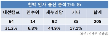 (조세금융신문) 박근혜 정부 출범 이후 현재까지 친박 인사 이른바 박피아의 공기업 잔치는 계속되고 있는 것으로 나타났다.민병두 새정치민주연합 의원은 5일 ‘공공기관 박피아 친박인명사전 2집’을 통해 “박근혜 정부 출범 이후 1년 6개월 동안 총 132개 공공기관의 기관장, 감사, 이사 등 213개 직위에 걸쳐 모두 205명의 친박 인사 투입이 이루어졌다”고 지적했다. 이는지난 3월 발간한 1집에 수록된 84개 공공기관, 117개 직위, 114명에 대비해보면 공공기관 친박 인사 투입이 6개월 만에 무려 두 배 가까이 증가한 것이다.친박 인사 205명 중 새누리당 출신이 92명(44.9%)으로 가장 많고, 대선캠프 출신이 64명(31.2%), 대통령 인수위원회 출신이 14명(6.8%)으로 나타났다. 또한, 기관장 부문에서는 대선캠프 24명(40%), 인수위 5명(8.3%), 합계 48.3%로 새누리당 출신 19명(31.7%)에 비해 16.6% 높은 비중을 보였다.민병두 의원은 "대선 후보 시절 '아무 원칙 없이, 전문 분야와 상관없는 곳에 낙하산으로 임명되는 관행은 더 이상 없을 것'이라던 박 대통령의 대국민 약속이 '공언(空言)'이 됐다"며 "현 정부의 공공기