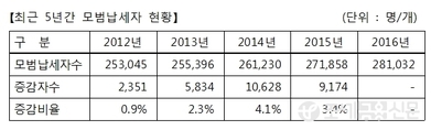 (조세금융신문=나홍선 기자) 서울시가 올해 28만명의 모범납세자를 선정, 역대 최다 인원을 기록했다.서울시는 최근 경기침체의 어려움 속에서도 지방세를 성실하게 납부한 자를 널리 알리기 위해 28만1,032명을 2016년 모범납세자로 선정했다고 2일 밝혔다.서울시는 또 모범납세자 중에는 납세규모, 지역사회 기여 등을 고려하여 자치구의 추천을 받아 선정한 185명의 유공납세자도 포함됐다고 덧붙였다.서울시에 따르면, 모범납세자 선정기준은 ’16년 1월 1일 현재 체납액이 없으면서, 최근 3년간, 3건 이상의 지방세를 납기 내에 납부한 자다.또한 유공납세자는 모범납세자 중에서 재정기여도 등을 고려해 자치구청장의 추천을 받아 선정했다.올해 모범납세자는 전년대비 9,174명(3.4%) 증가했으며, 이 중 5년 이상 모범납세자는 전체의 64.7%인 18만1,852명이었으며, 10년 이상모범납세자도 전체의 15.5%인 4만3,573명이었다.또, 2015년 서울시의 지방세 징수액 기준(가결산) 시민 1인당 지방세 부담액은 175만원인 반면, 모범납세자는 1인당 715만원을 납부했다.모범납세자에게는 시 금고(우리)은행에서 대출시 최대 0.5%의 금리인하와 22종의 각종 수수료