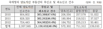 (조세금융신문) 최근 3년간 부동산 거래에 따른 양도소득세를 신고하지 않거나 과소신고해 국세청에 적발된 건이 113만건에 달하는 것으로 나타났다. 또, 이로 인해 위반자들이 추가 납부한 가산세만도 1조 3,456억원에 달하는 것으로 밝혀졌다. 국회 기획재정위원회 소속 심재철 국회의원(안양동안을, 기재위)이 국정감사를 위해 국세청으로부터 제출받은 ‘부동산 양도소득 축소 신고·무신고 등 발생현황’ 자료에 따르면, 국세청에 신고된 부동산 양도소득 건수는 2010년 80만 4,802건, 2011년 82만 8,320건, 2012년은 72만 4,443건에 달했다. 하지만 국세청이 등기부 기재가액 조사를 통해 거래내용을 확인하거나 신고자료 검증, 현장조사 등을 통해 적발한 무신고 또는 과소신고건은 2010년 38만 3,388건(전체신고건수 대비 47.6%), 2011년 38만 2,262건(46%), 2012년 36만 4,982건(50.4%)으로 총 113만 632건(48%)에 달했다. 국세청에 신고된 전체 부동산 양도소득 신고건수와 비교해 보면 무신고 및 과소신고 건수가 대략 절반에 달해 국민 대부분이 부동산 양도에 따른 신고를 제대로 하지 않는 것으로 밝혀졌다. 이로