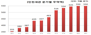 (조세금융신문=박가람 기자) 올해 3분기 인천세관을통한IT 반도체 수출이 늘면서 전체 수출도 호조를 보였다. 인천본부세관이 26일 발표한 '2018년 3분기 인천세관 수출입 동향'에 따르면, 인천세관(인천공항·인천항)을 통한 수출은 전년대비 21.9% 증가한 529억 달러를 기록했다. 3분기 IT 반도체 등 전기전자류와 기계류 수출이전년대비 각각 35.8%, 27.3% 증가한 것이 주요 수출증가 요인이라고 세관 관계자는 설명했다. 국가별 수출액은 중국(158억달러), 아세안(105억달러), 홍콩 (72억달러), 미국(55억달러), EU (43억달러) 순으로 높았다. 인천세관의 3분기 수입은 전년대비 13.9% 증가한 1117억달러로, 총 무역액은 16.3% 증가한 1646억달러를 기록했다. 특히 기계·전자제품의 수입은 전체 수입의 51.1%를 차지했으며,전년 동기대비 16.0% 증가했다. 인천공항과인천항을 각각 살펴보면,인천공항을 통한올해 3분기 수출실적은 전년 동기대비 25.8% 증가한 310억달러, 수입실적은 15.3% 증가한 609억달러로 집계됐다.무역규모는 919억달러로 전국의 10.9%를 차지했다. 같은 기간 인천항을 통한 수출은 전년