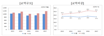 (조세금융신문=박가람 기자) 지난해 중소기업의 수출액이3년 연속 증가한 반면, 전체 기업 수출에서 중소기업이 차지하는 비중은 최근 5년 동안 비슷한 수준인 것으로 나타났다. 관세청과 통계청이 26일 발표한 '기업 특성별 무역통계로 본 2017년 중소기업 수출입 현황' 자료에 따르면, 중소기업의 수출은 전년대비 9.5% 증가했으며 전체 기업 수출액의 17.6%를 차지한 것으로 나타났다. 전체 기업 수출에서 중소기업의 수출액 비중은 2013년과 2014년에 18.4%, 2015년에 17.3%, 2016년에 18.6%, 2017년에 17.6%로 크게 변함이 없었다. 중소기업의 품목별 수출은재화·성질별로 봤을 때일반기계(15.0%), 정밀기계(9.5%), 섬유직물(5.5%) 등이 전년대비 높은 비중을 차지했다. 국가별 수출은 동남아(28.6%)가 수출 비중이 가장 컸으며 이어중국(21.7%), 미국(11.1%) 등 순이었다. 지난해 중소기업의 수입액은 전년대비 13.1% 증가한 1189억달러로, 전체 기업 수입액의 25.2%를 차지했다. 관세청관계자는 "이번 발표는 관세청 수출입신고 기준 데이터를 분석하고 통계를 낸 것으로, 그 외 구조적인 문제는 중소벤
