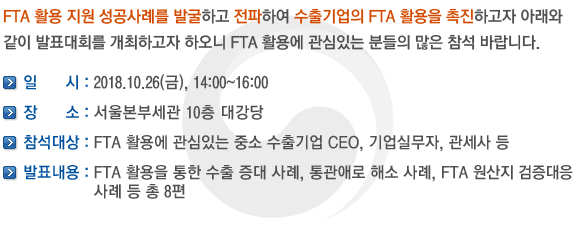 (조세금융신문=박가람 기자) 관세청이 오는 26일 서울본부세관에서‘2018 FTA 활용 지원 우수사례 발표대회’를 개최한다. 이번 대회에서는 철강, 자동차, 식품, 화학제품, 의류 등 다양한 산업분야의 FTA 활용 사례가 소개될 예정이며, 기업 실무자들이 직접 성공사례 발표에 나선다. 관세청 관계자는“FTA를 아직 활용하지 못하는 중소·중견 기업들이 참석해 우수사례를 자신의 기업에도 적용할 수 있도록 많은 참여를 기대한다"고 말했다. 한편, FTA 활용 지원 우수사례 발표대회는 FTA 활용경험이 부족한 국내 중소·중견기업이 다양한 사례를 공유해 FAT를 적극적으로 활용할 수 있도록 지난 2007년부터 매년 개최됐다.