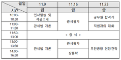 (조세금융신문=박가람 기자) 광주본부세관은 광주지역 청년 일자리 지원의 일환으로 세관 전문성을 활용한 '관세 아카데미'를 오는 11월 9일부터 시행한다고 밝혔다. 아카데미는 관세사 자격증과 관세직 공무원 시험과목을 대상으로 11월 9일, 16일, 23일 총 3회에 걸쳐 조선대학교에서 진행된다. 마지막 날인 23일에는새내기 공무원의 생생한 경험담을 담은 공무원 합격기, 직원과의 대화, 공직생활 체험을 위한 무안공항 견학 프로그램도 준비돼 있다. 광주본부세관 관계자는 "이번 프로그램이 청년 일자리 정보제공에 좋은 계기가 될 것으로 기대한다"며 "지역 대학생들의 많은 참여를 바란다"고 말했다. 한편, 교육신청은 광주본부세관 홈페이지에 게시된 신청서를 작성해 오는 31일까지 이메일로 제출하면 된다.