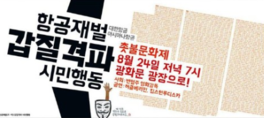 (조세금융신문=박가람 기자) 대한항공과 아시아나항공 직원들이24일 오후 7시광화문광장에서 '항공재벌 갑질 격파 시민행동' 촛불문화제를 개최한다. 지난 7월 대한항공·아시아나항공 직원들이 함께 모여항공재벌 퇴진을 외친 후두번째로 열리는 공동집회이다. 이날열리는 문화제에서는대한항공·아시아나항공조합원들과 참가자들이 함께'가면벗기' 퍼포먼스도 진행된다. 또 허클베리핀, 킹스턴루디스카 두 인디그룹의 공연으로 문화제를 이어나갈 예정이다. 문화제에는 공공운수노조와 대한항공·아시아나항공 직원들을 비롯해 20여개의 시민단체와 시민들이 참석할 예정이다. 문화제 기획단은 "많은 시민단체와 함께 준비한 행사인만큼 연기하는 것도 어려운 결정"이라며 "태풍도 무섭지만 항공재벌의 갑질이 더 무서워 진행하기로 결정한만큼 많은 직원, 시민 여러분이 함께해주셨으면 좋겠다"고 밝혔다. 한편, 문화제 기획단에 따르면 이달 23일 기준 '대한항공 총수일가 엄중처벌을 위한 범국민서명운동'에는 온란인 4000여명, 오프라인 2600여명이 동참한 것으로 나타났다.