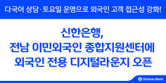 (조세금융신문=송기현 기자) 신한은행은 9월 22일 전남 영암군 소재 전남 이민외국인 종합지원센터에 외국인 전용 '디지털 라운지 대불산업단지'를 오픈한다. 이 디지털 라운지에는 디지털데스크와 스마트 키오스크가 배치되고, '신한 글로벌 플러스' 서비스가 외국인 고객의 은행 업무처리를 돕는다. 방문 고객은 디지털데스크를 통해 화상상담 직원과 베트남어, 인도네시아어, 중국어, 영어 등 10개 언어로 신규 계좌를 만들거나 체크카드를 발급받을 수 있다. [조세금융신문(tfmedia.co.kr), 무단전재 및 재배포 금지]